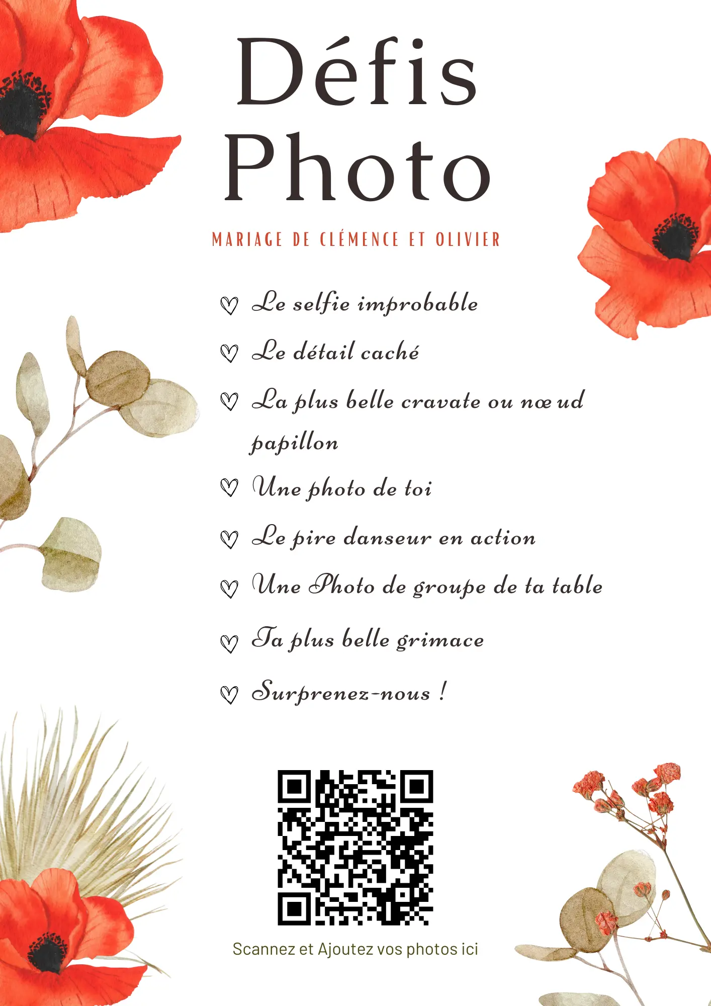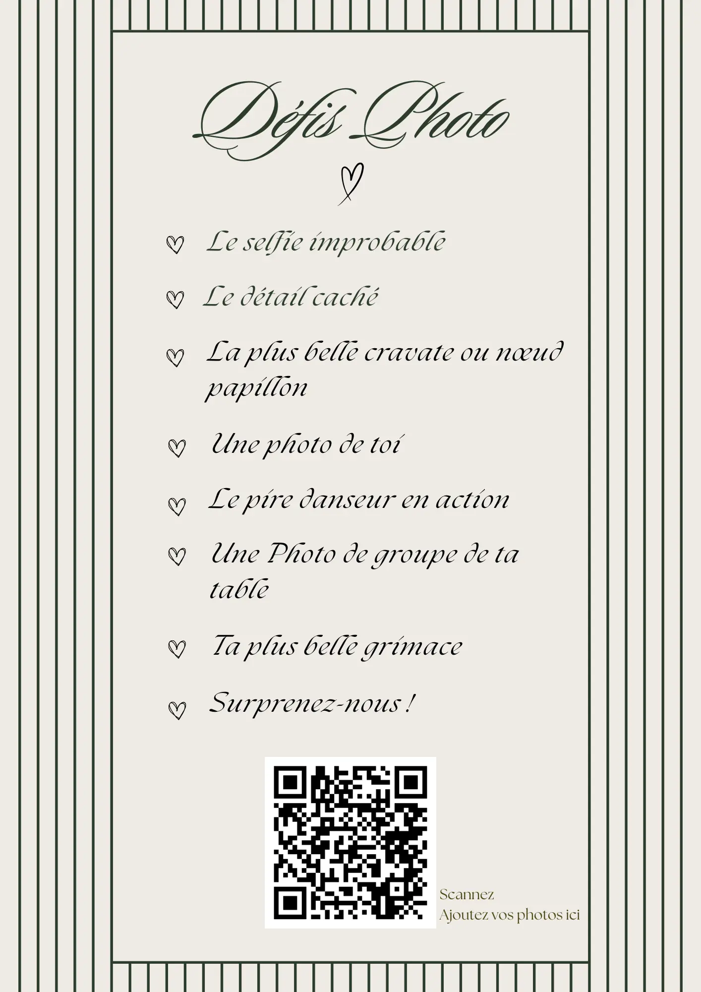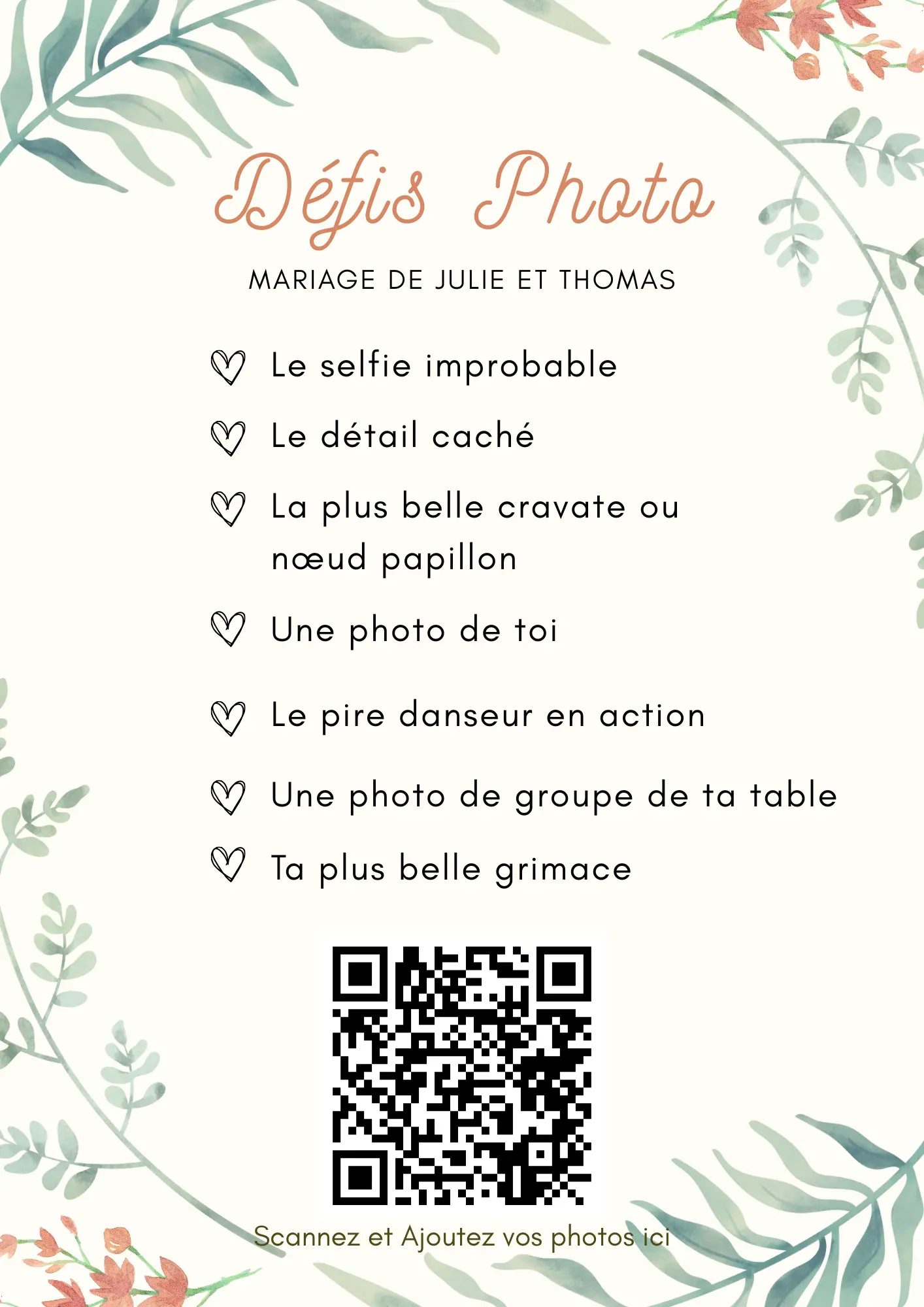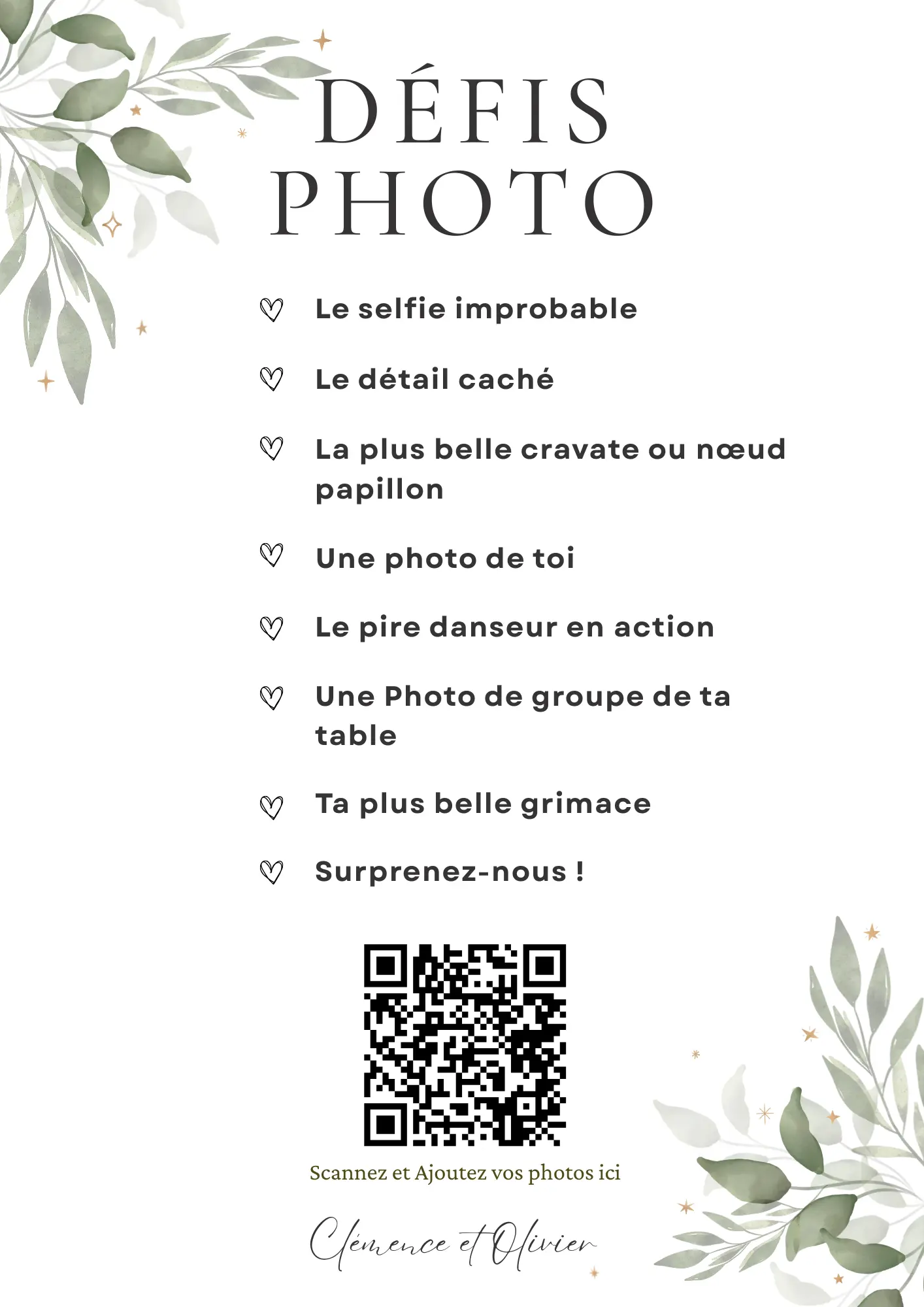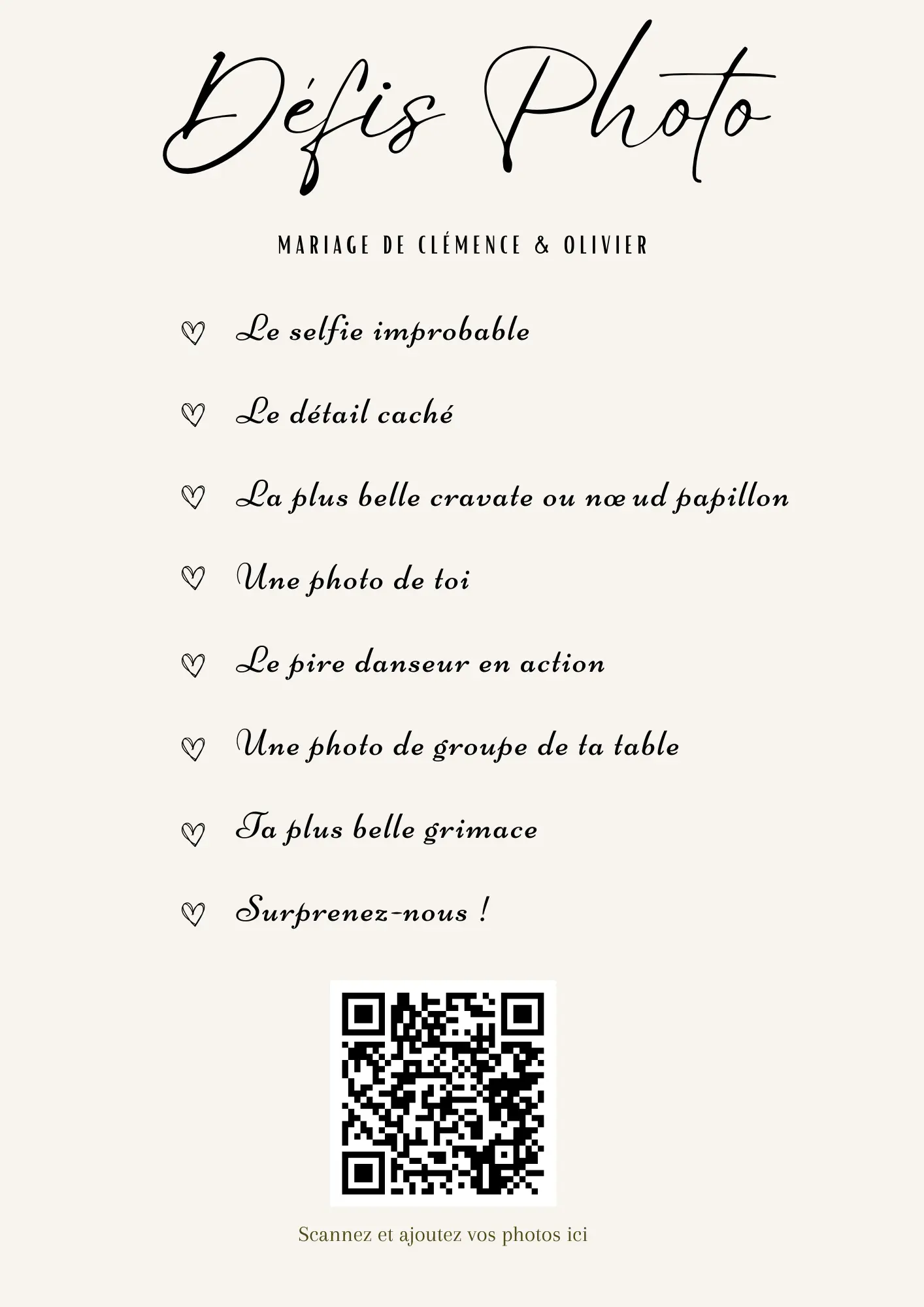 Vos invités scannent votre QR code et partagent instantanément leurs photos et vidéos dans votre album privé — sans application à installer.