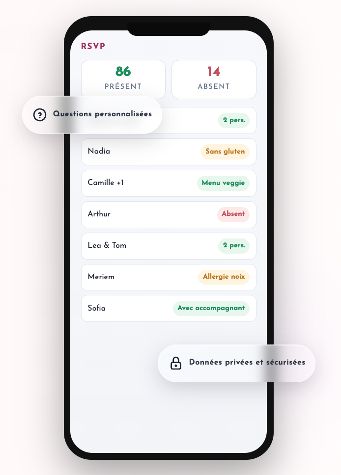 Liste d'invités, confirmations, +1 et restrictions alimentaires… Tout est centralisé avec le RSVP numérique intégré.